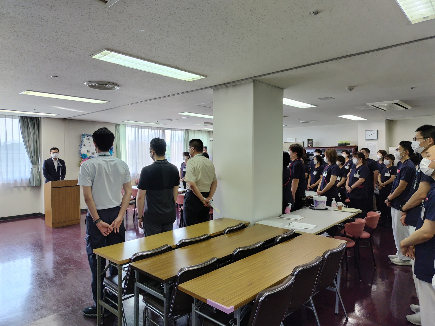 先月に引き続き、秩父市立病院の朝礼に参加し、朝礼訓示を行いました。今回は「市立病院建設計画策定委員会」と「夜間オンライン診療窓口の開設」について、私から直接情報をお伝えしました。