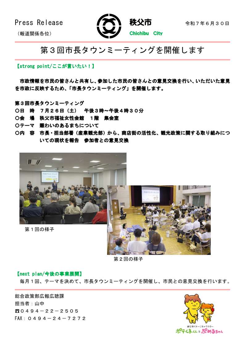 現在、秩父地域にお住まいの皆さまと直接意見を交わす「市長タウンミーティング」を毎月開催し、市政情報を共有するとともに、皆さまとのコミュニケーションを大切にしています。今回は第3回の市長タウンミーティングの開催についてお知らせいたします。